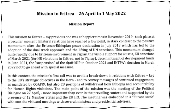 Första sidan av EU:s rapport från uppdraget till Eritrea 2022, skriven av Lothar Jaschke, chef för Africa 5 (Afrikas horn) vid EU:s utrikestjänst (EEAS).