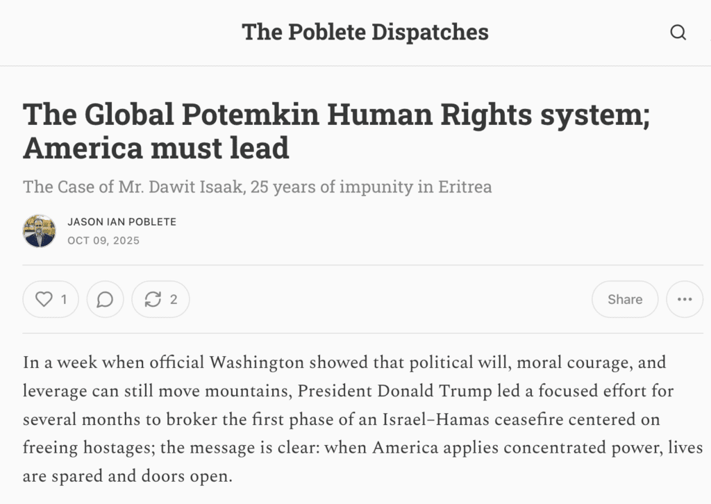 Article by Jason Poblete “The Global Potemkin Human Rights; America Must Lead – The Case of Mr. Dawit Isaak, 25 of impunity in Eritrea”