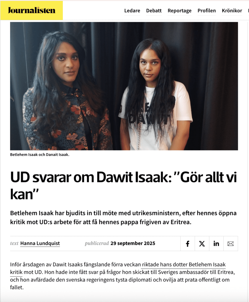 UD svarar om Dawit Isaak: “Gör allt vi kan” – Journalisten, 29 september 2025