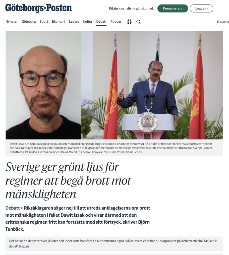 “Utred Eritreas brott mot journalisten Dawit Isaak” – Svenska Dagbladet, 23 September 2025, (275 000 readers) PRINT