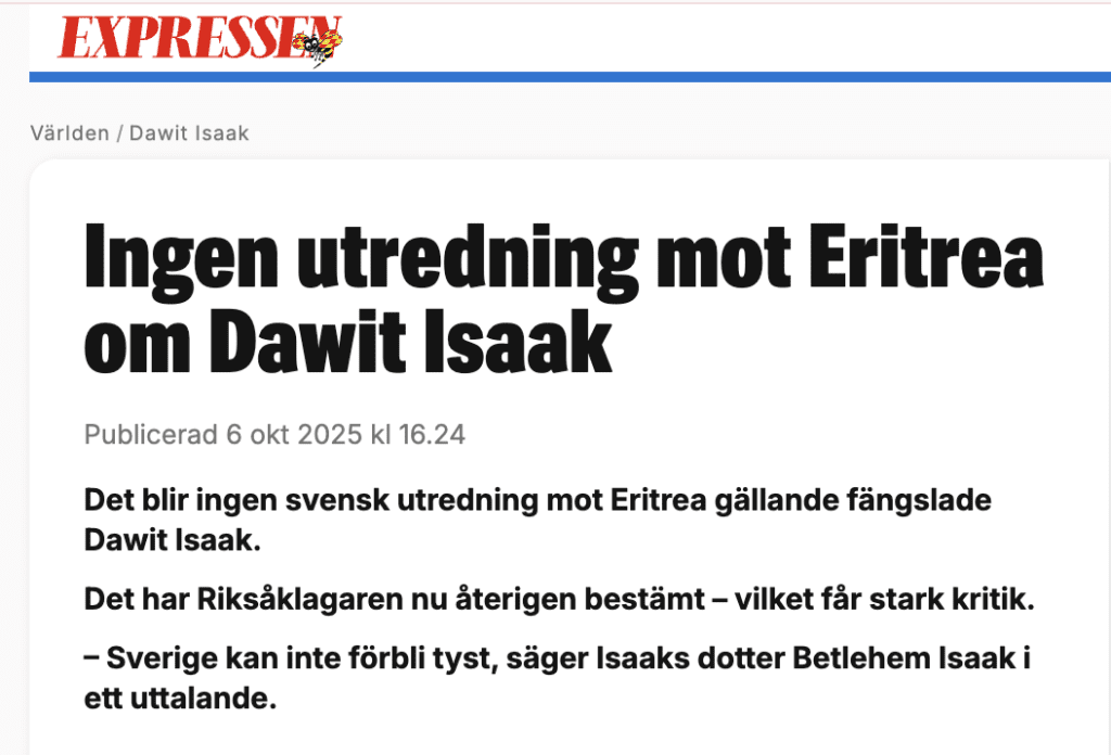 Ingen utredning mot Eritrea om Dawit Isaak – Expressen, 6 October 2025 (309 000 readers) PRINT